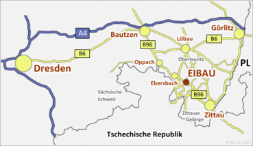 Den Ortsteil Eibau der Gemeinde Kottmar im Landkreis Görlitz (Dreiländereck Deutschland-Polen-Tschechien) erreichen Sie mit dem PKW über die Autobahn A 4, Abfahrt Bautzen-West weiter die B 96 ca. 30 km Richtung Zittau.