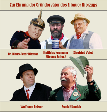 Bei nunmehr über 30 Jahren erfolgreicher Bierzugtradition kann der Festumzug auf viele Mitstreiter zurückblicken. Viele Eibauer und Walddorfer bereicherten den Bierzug und prägten ihn über viele Jahre hinweg. Manche sind mittlerweile gesundheitsbedingt ausgeschieden oder verstorben. Sie werden den Gästen des Bierzugs jedoch durch ihren unermüdlichen Einsatz und ihre mitreisende Begeisterung in Erinnerung bleiben. Die Bierzugsplakette zum 20. Bierzug im Jahre 2012 haben wir daher unseren Gründungsvätern gewidmet.