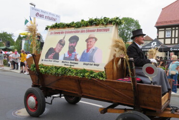 Der Eibauer Traditionspfleger und Mitglied des Organisationsteams Christfried Riedel gestaltete einen Wagen mit den Banner der verstorbenen Gründerväter Dr. Klaus-Peter Dittmar, Matthias Neumann und Siegfried Voigt zum 30. Jubiläum. Unser Bierzug- Initiator Frank Münnich war auch beim 30. Bierzug wieder als Förster Sieber neben unseren Bürgermeister Michael Görke mit dabei, dieses Mal als Ehrengast und Ehrenbürger der Gemeinde Kottmar in einer der Ehrenkutschen.