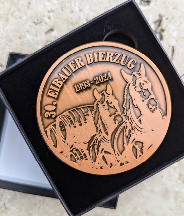 Zum 30. Jubiläum gibt es vom Eibauer Bierzug eine Ehrenplakette. Die Plakette ist aus Messing mit Bronzelegierung und Auf der einen Seite das Wappen der Gemeinde Kottmar mit unserem Dankeschön und auf der anderen Seite ein Pferdegespann mit Brauereiwagen.