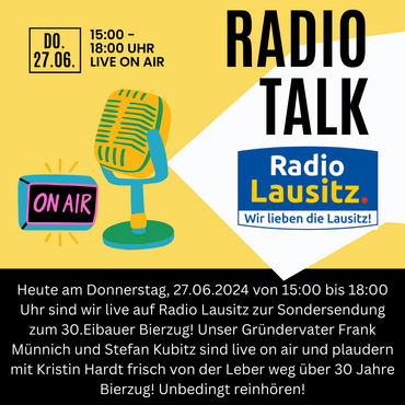 Am Donnerstag, 27.06.2024 von 15:00 Uhr bis 18:00 Uhr sind wir live auf Radio Lausitz zur Sondersendung zum 30.Eibauer Bierzug! Unser Gründervater Frank Münnich und Stefan Kubitz sind live on air und plaudern mit Kristin Hardt frisch von der Leber weg über 30 Jahre Bierzug!