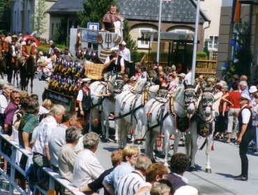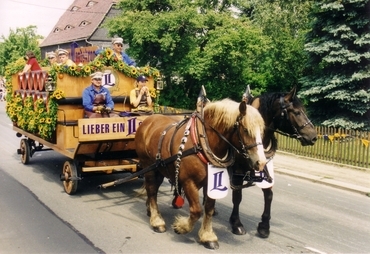 Die Eibauer Brauerei mit ihrem traditionellen Fasswagen und dem Sechsspänner aus weißen Schimmeln von Christian Metzig aus Zittau im Jahre 2003.