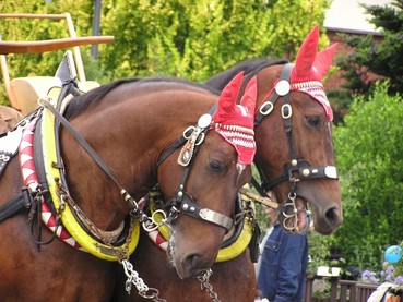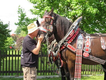 Die Warmblüter von Franz Hoser aus Hainewalde mit über 50 Jahre alten Geschirr und selbst hergestelltem, gehäkeltem Kopfschmuck.
