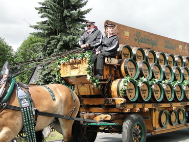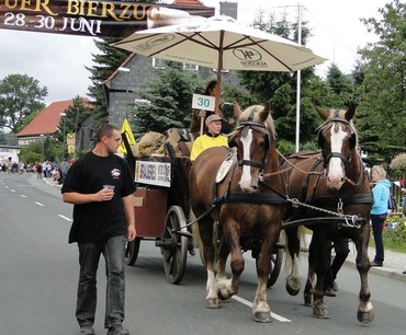 Der von der Gaststättenbrauerei PIVOVAR KOCOUR aus Tschechien gestaltete Wagen (hier im Bild zum Bierzug 2013) wird gezogen von 2 süddeutschen Kaltblütern. Die Füchse sind 1,70 m groß und 10 Jahre alt. Kutscher sind Torsten und Jenni Heinz aus Pirna.