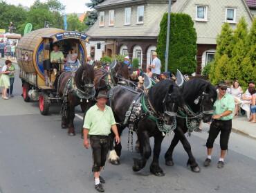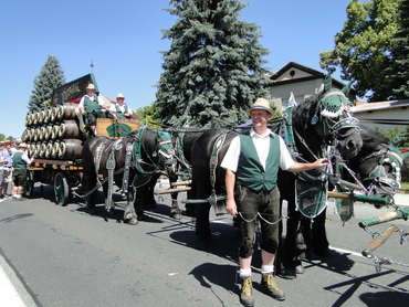 Der Faßwagen der Bergquellbrauerei Löbau, hier 2013 gezogen von 3 Schwarzwälder Stuten, ist jede Woche in Löbau bei der Bierauslieferung in der Stadt zu sehen. Im Bild mit dem Kutscher Sandro Zieschang und seinem Vater Martin aus Uhyst. Gefahren wurde in tradioneller Kumtanspannung. Bei den Pferden handelt es sich um Mona, Lissi und Mirabell, Sie sind zwischen 5 und 9 Jahren alt. Der Wagen wiegt 1,5 to und kann über 3 to zuladen. Der Fasswagen wird zur wöchentlichen Bierauslieferung in Löbau genutzt und ist der größte Fasswagen dieser Art.