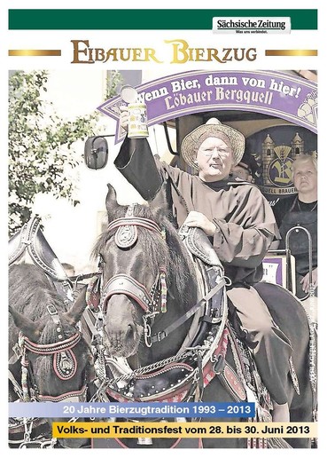 2013: Die Titelseite zeigt Steffen Dittmar mit seinem Fasswagen der Bergquell-Brauerei Löbau GmbH. Als Präsident des Sächsischen Brauerbundes e.V. hat er wesentlichen Anteil an der Fortführung des Eibauer Bierzuges ab 2013.