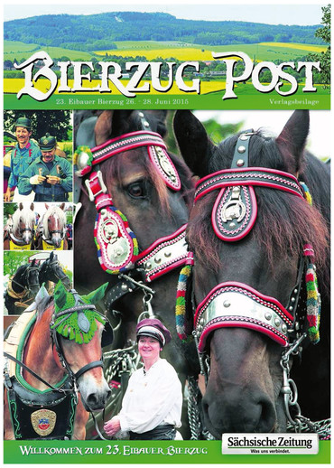 2015: Auch im Jahr 2015 gab es wieder eine Bierzug Zeitung. Das Titelbild der Ausgabe 2015 mit den treffenden Namen „Bierzug Post“ widmete sich erneut – wie auch die Plakette - den vielen Gespannführern und ihren Begleitpersonen, welche ihre Pferde sicher entlang der B 96 an den Gästen vorbei führen (im Bild groß das Prunkgespann der Bergquellbrauerei Löbau GmbH und klein das Gespann der Radeberger Exportbierbrauerei mit Begleitung). Ab diesem Jahr heißt die Ausgabe nun offiziell „Bierzug Post“.