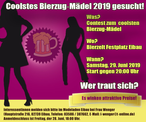 Achtung, zusammen mit dem Modeladen Ilona Wenger in Eibau suchen wir das coolste Bierzug‐Mädel und veranstalten am Samstag im Festzelt am Volkshaus in Eibau einen kleinen Contest.