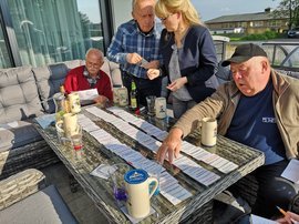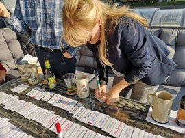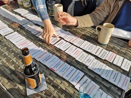 Das Bierzug-Team traf sich letzte Woche beim Bürgermeister bei schönsten Bierwetter zum Kartenlegen. Kartenlegen bedeutet bei uns jedoch nicht etwa wie man vermuten könnte, ein Blick in die Zukunft. Nein, mit den Kärtchen wird die Reihenfolge der Teilnehmer festgelegt. Das ist wichtig, denn natürlich soll der Umzug sicher über die Bühne gehen. So sollen die Pferde genügend Abstand zu Zugmaschinen und lauten Kapellen haben, damit sie sich nicht erschrecken. Dieses Jahr haben wir auch einen eventuellen Regenschauer besser im Griff! Daher laufen die Riesenseifenblasen im hinteren Block. Letztes Jahr hatten wir sie zu weit vorn platziert. Das ging bisher immer gut, weil es fast nie regnete. Durch den Regen im letzten Jahr wurde die Straße dann schmierig, was die Pferde unsicher machte. Also liebe Seifenblasen, nicht böse sein, über den Startplatz 58!
