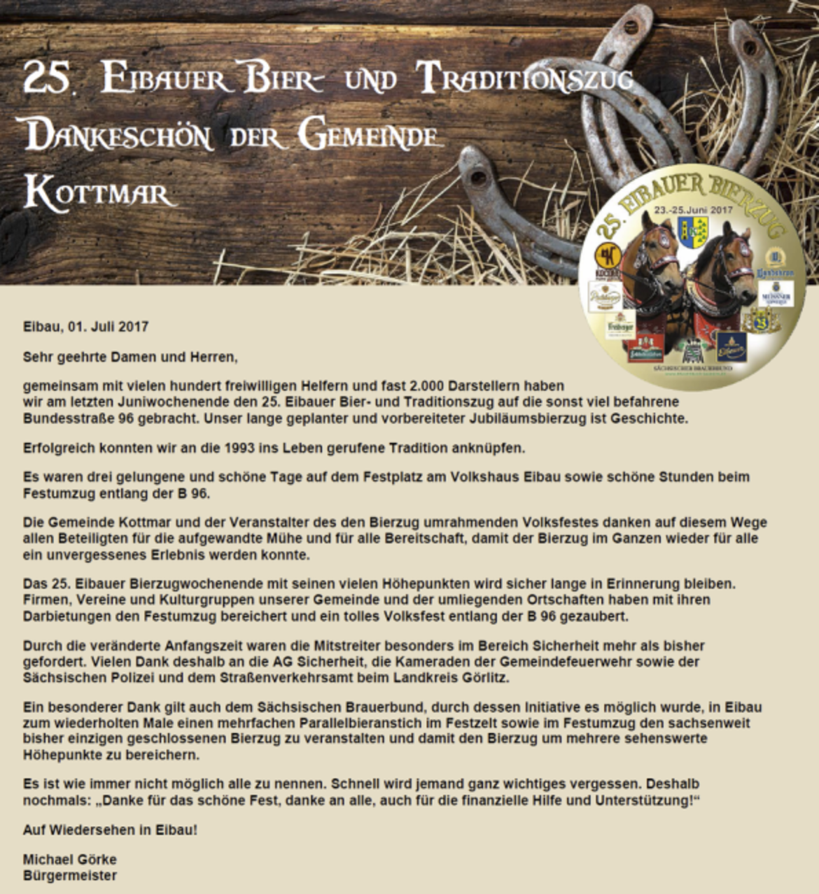Organisator des Bierzugs ist die Gemeinde Kottmar. Bei Fragen oder Hinweisen zum Festumzug wenden Sie sich bitte an: info@gemeinde-kottmar.de Tel.: 03586 - 78 04 30 oder 03586 - 78 04 21 sowie: 0171 / 1414296